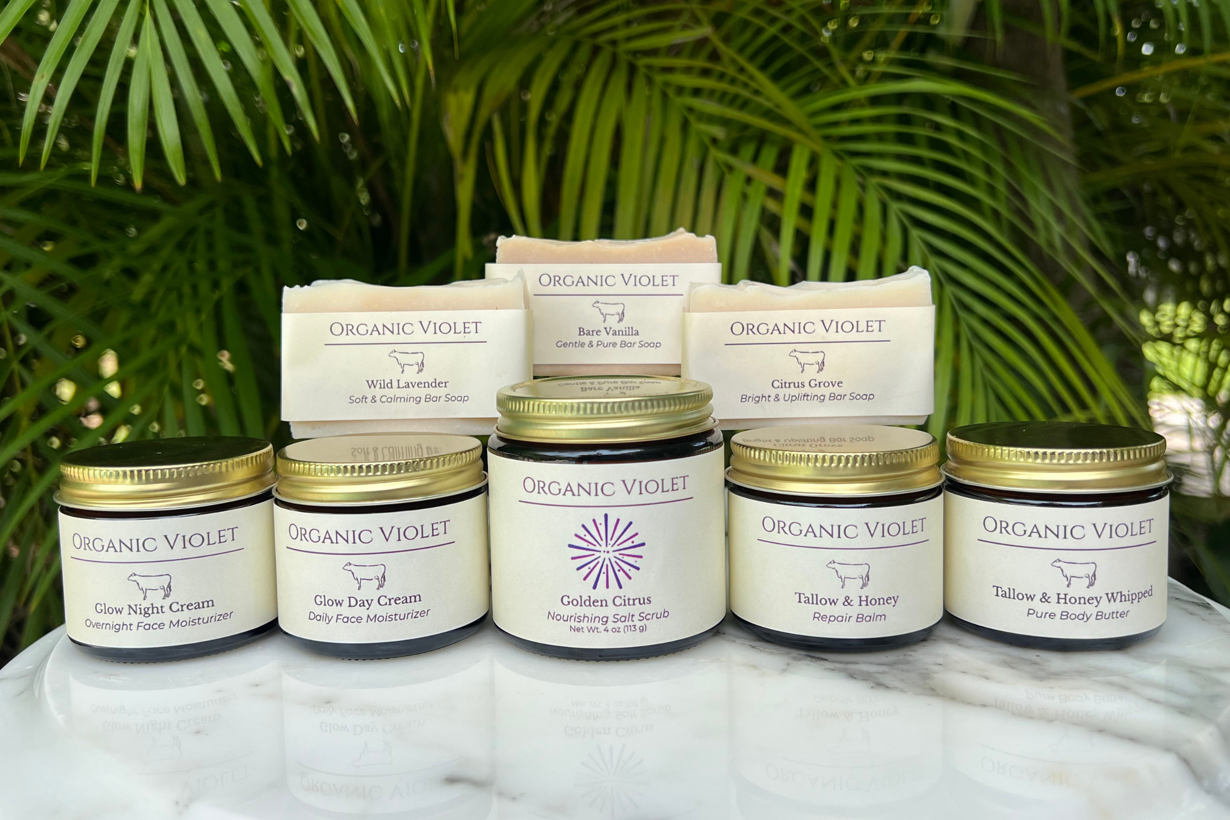 Organic Violet crafts pure, tallow-based skincare, guided by our farm-to-skin philosophy. We use only wholesome, natural ingredients from the earth to nourish your skin and body for a healthy, radiant glow, free from preservatives and fillers.